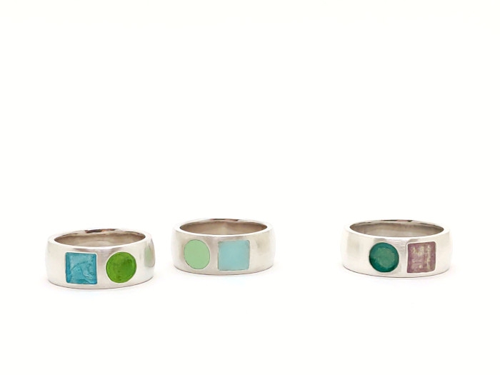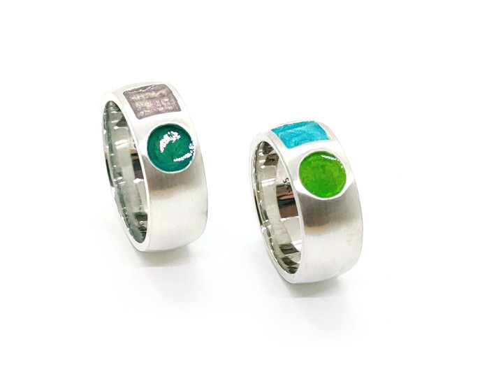 Ringe mit gewölbter Schiene aus Sterlingsilber und Emaille. Die Ringe sind 8mm breit und 2mm stark.