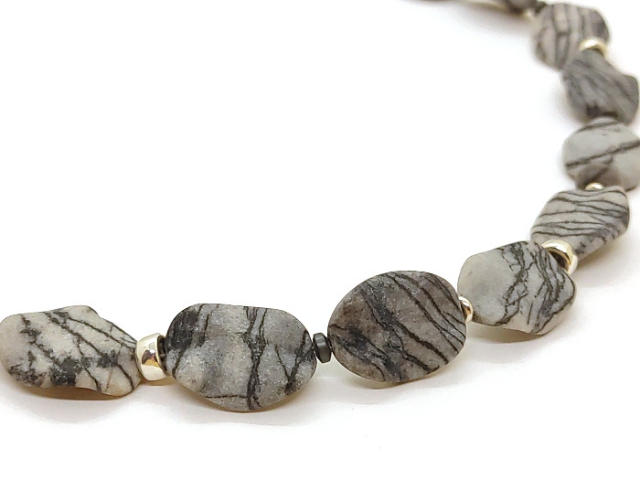 Einzigartige Steine bestimmen diese Kette, jeder hat eine andere Musterung. Der Picasso-Jaspis ist eine Varietät von vielen in der Jaspis Familie.