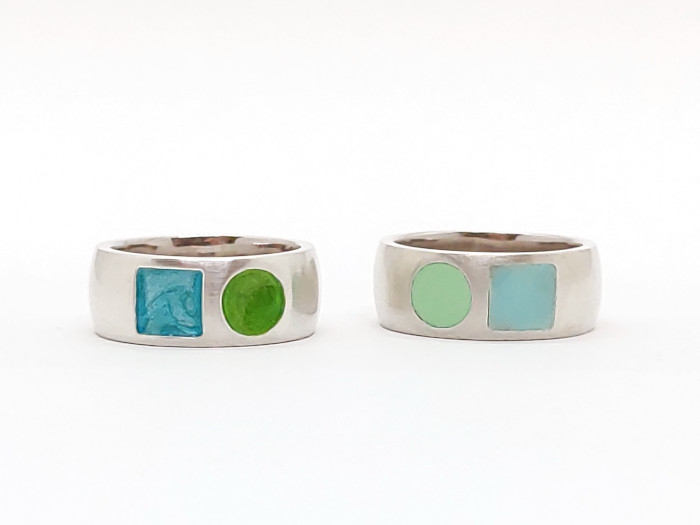 Ringe mit gewölbter Schiene aus Sterlingsilber und Emaille. Die Ringe sind 8mm breit und 2mm stark.